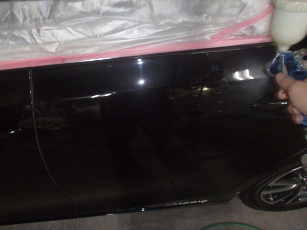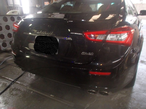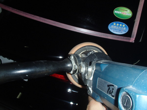 ホログラム防止の為ポリッシャーをランダムな動きに変えて磨き、洗車、脱脂、ガラス部養生