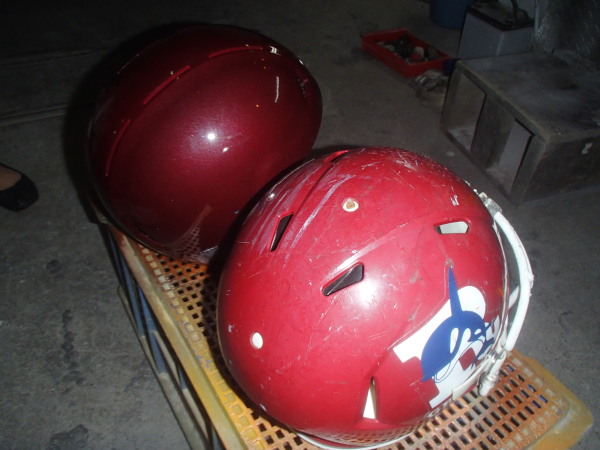 無地の新品アメフトヘルメットにチームカラーのシャンパンゴールドにペイントさせて頂きました、すぐ試合で使われるとの事でしたが